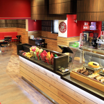 The project brief was to transform a tired café and seating area in the buildings main entrance into a new café eatery, improve queue times and increase client spend.